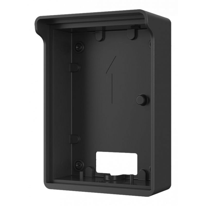 Soporte con visera protectora diseñado para la estación de exterior VTO2202F, instalación en superficie, fabricado en aleación de aluminio, acabado en color negro, proporciona protección de tipo IP65 con sellado adicional, pensado para ambientes exteriores donde la durabilidad y la resistencia a la intemperie son requisitos clave.