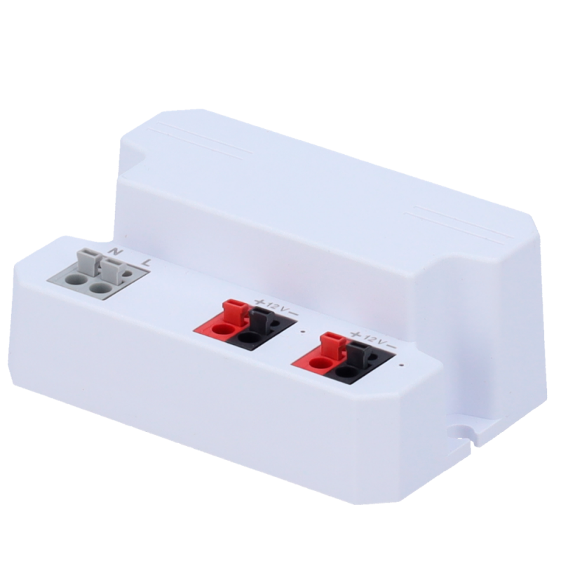 Fuente de alimentación conmutada, entrada AC de 100 a 240 V, salida doble canal, suministra DC 12 V a 2 A con una potencia total de 24 W, acabado en color blanco, dimensiones compactas para integración en diferentes espacios.