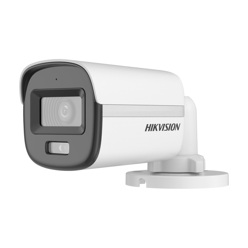 Cámara Bullet Hikvision 4 en 1 con tecnología HDTVI, HDCVI, AHD y CVBS. Resolución Full HD de 2 megapíxeles, lente de 2.8 mm, luz blanca con alcance de 20 metros y función ColorVu para imagen a color 24 horas, protección impermeable IP67.