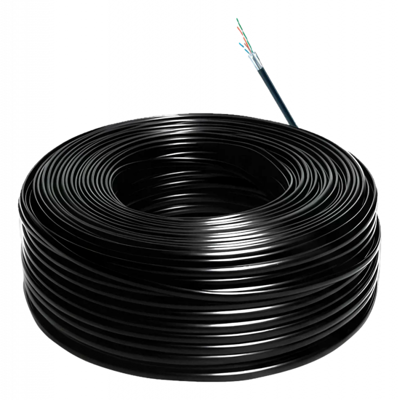 Cable UTP categoría 6 para exterior, conductor de cobre OFC con pureza del 99,9 por ciento, cubierta exterior tipo PE, presentado en bobina de 305 metros. Diseñado para instalaciones en exteriores, soporta tracción y compresión, ofrece conexiones estables, cumple los estándares internacionales ANSI TIA 568.2 D, ISO IEC 11801 e IEC 61156. Diámetro del conductor de 0,45 mm, compatible con alimentación PoE hasta 57 V y 1 A, adecuado para enlaces de hasta 90 metros en instalación permanente y 100 metros en canal completo con temperaturas de hasta 50 grados Celsius.