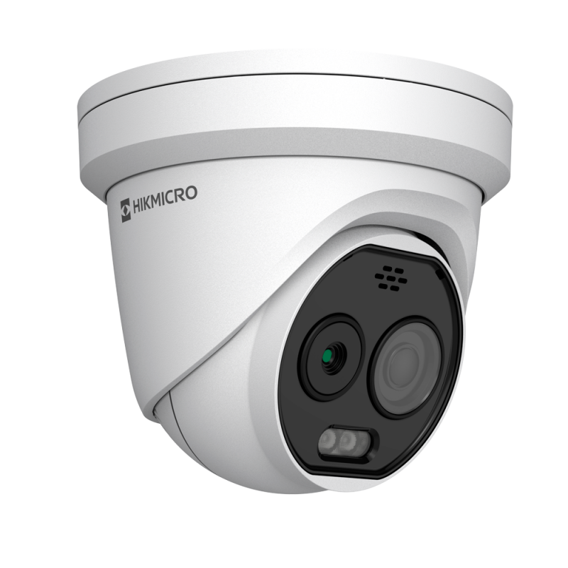Cámara térmica Dual IP Hikmicro, sensor térmico de 256x192 VOx y lente de 3,6 mm, sensor óptico de 5 megapíxeles con lente de 4,3 mm, sensibilidad térmica de hasta 25 mK, medición de temperatura de -20 a 150 grados Celsius con precisión de 8 grados Celsius, funciones de detección preventiva de incendios y alarma, modo doble para supervisión térmica y visible, protección IP67, compatible con ONVIF y almacenamiento interno mediante ranura MicroSD hasta 512 GB.