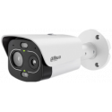 Cámara térmica IP híbrida Dahua Eureka Series, sensor térmico de 256 × 192 VOx 12 micras con óptica de 7 mm y NETD menor o igual a 25 mK, módulo visible de 4 megapíxeles 2688 × 1520 con óptica fija de 6 mm, IR con alcance de hasta 50 metros, luz blanca hasta 30 metros, permite fusión térmica y visible, inteligencia artificial con tripwire, intrusión, detección de calor, clasificación de humano y vehículo, doble micrófono, dos entradas y dos salidas de alarma, ranura MicroSD hasta 256 GB, protección IP67 e IK10, alimentación de 12 a 24 VDC y PoE.