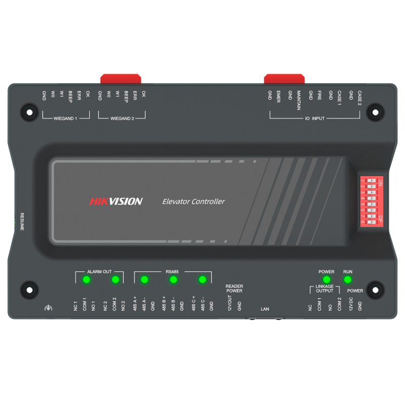 Controladora de ascensores Hikvision, huella, tarjeta, QR o PIN, 2 relés, TCP/IP y RS485, hasta 128 pisos, sin caja, iVMS-4200.