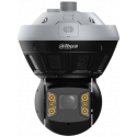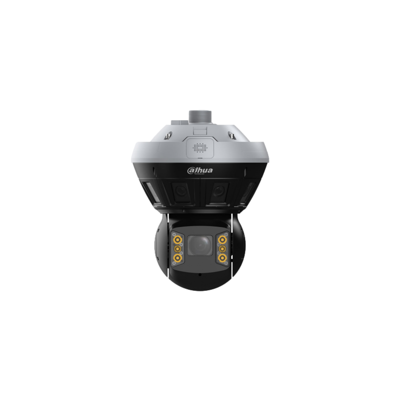 Domo PTZ IP panorámico 180° Dahua WizMind, 8MP (4×2MP más 4MP) con 25 o 30 imágenes por segundo, óptica fija de 2,8 mm F1.0 y zoom óptico de 40X de 5,2 a 210 mm, iluminación infrarroja hasta 150 metros y luz cálida hasta 100 metros, WDR 120 dB y estabilización por giroscopio. Inteligencia artificial perimetral, mapa de multitudes, densidad de vehículos, metadatos y detección facial, vista panorámica aumentada y seguimiento inteligente, tres entradas y dos salidas de alarma, protección IP67, IK10 y tratamiento especial anticorrosión, alimentación PoE++ o de 36 VDC.