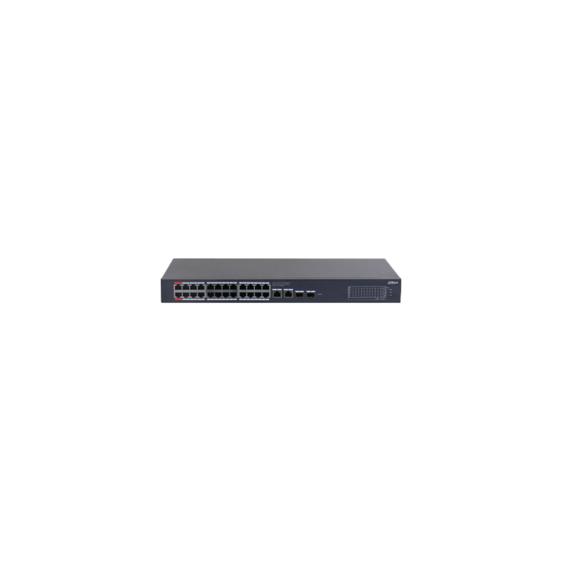 Switch cloud gestionable con 24 puertos PoE Gigabit y 4 puertos uplink Gigabit, incluyendo 2 RJ45 y 2 SFP. Gestión cloud mediante DoLynk Care a través de web y app, entrega PoE total de 240 W con soporte para puertos BT de hasta 90 W, función de PoE inteligente y larga distancia PoE de hasta 250 metros, compatibilidad con STP/RSTP y protección de bucle. Carcasa metálica con protección ESD y contra sobretensiones, instalación en sobremesa o montaje en rack.