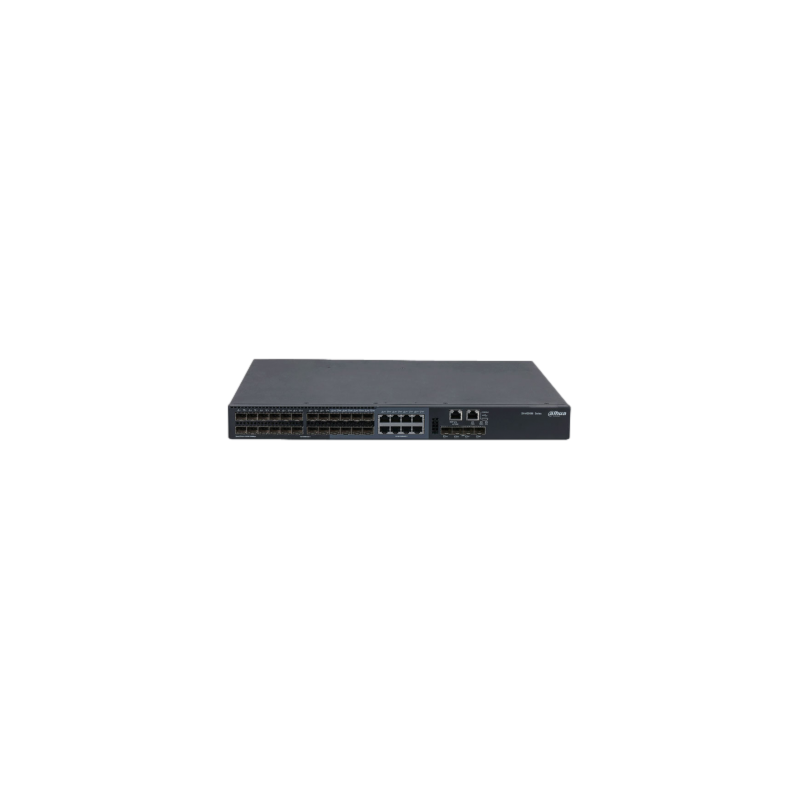 Switch L3 gestionado con 24 puertos SFP de 100 a 1000 Mbps y 4 puertos SFP+ de 1 a 10 Gbps para agregación de red, arquitectura IRF2 para apilado resiliente y alta disponibilidad, avanzadas funciones L2 y L3 como VLAN, ACL, QoS, OSPF y BGP, gestión por Web, CLI y SNMP.