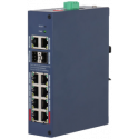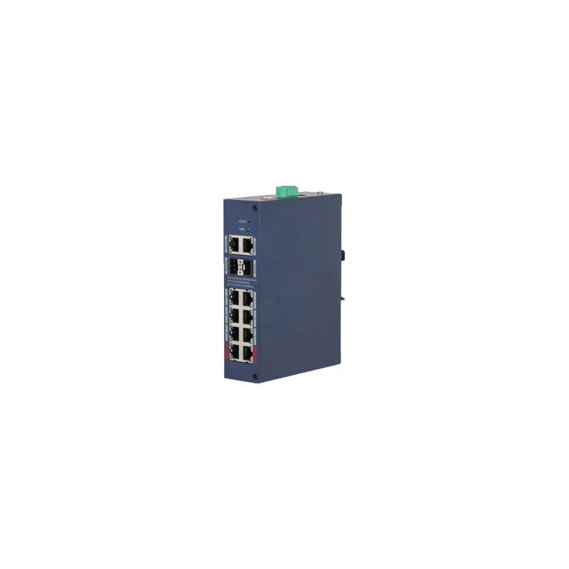 Switch PoE gestionado endurecido, 8 puertos RJ45 Gigabit PoE y 4 uplinks, entrega PoE total de 110 W con 2 puertos BT de hasta 90 W, capacidad de conmutación de 24 Gbps, gestión local web y cloud con visualización de topología LLDP, PoE extendido hasta 250 metros y watchdog, protección IP30 y IK06, instalación DIN o en sobremesa.