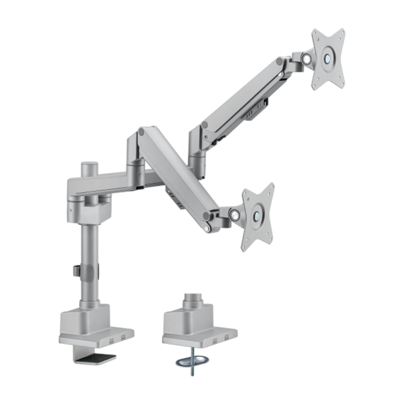 Soporte de doble brazo para monitores de instalación en mesa, permite colocar y ajustar dos monitores para lograr una posición ergonómica, mejora la organización del espacio y facilita la gestión de la altura, inclinación, giro y distancia. Equipado con base de sujeción mediante abrazadera o fijación directa, ofrece flexibilidad para la disposición de los monitores en cualquier escritorio.