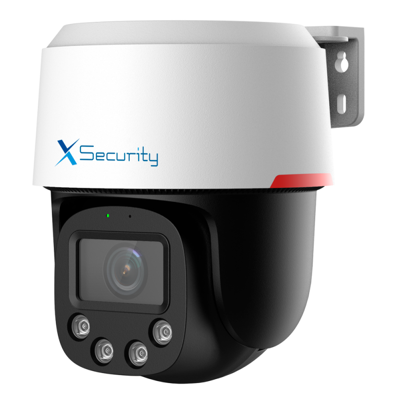 Cámara PT IP X-Security Wizcolor, 4 megapíxeles (2560x1440), CMOS 1/1,8 pulgadas, lente fijo de 4 mm, imágenes a color las 24 horas incluso en condiciones de baja iluminación y oscuridad, iluminación mínima de 0,0005 lux F1.0 en color, 0 lux con luz blanca, luz blanca con alcance de hasta 30 metros, detección de humanos con disuasión activa, advertencia por luz blanca y alarma de sonido, audio bidireccional con micrófono y altavoz integrados, grabación interna en tarjeta MicroSD de hasta 512 GB, interfaz Ethernet RJ45 10/100 BaseT y Wi-Fi de 2,4 GHz, protección impermeable IP66, incluye brazo a pared y material de instalación.
