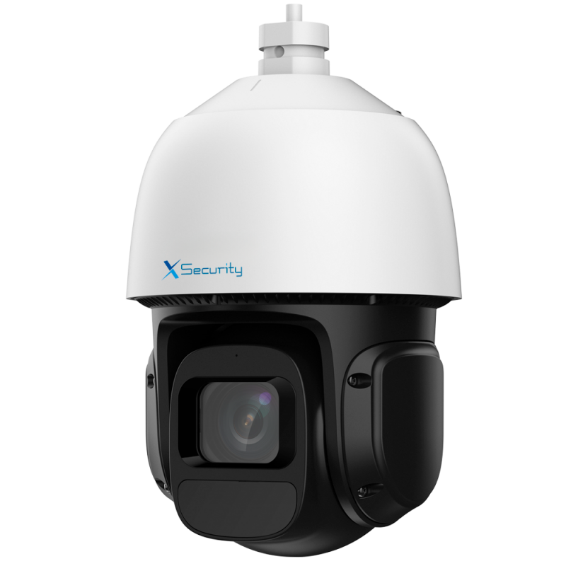 Cámara IP PTZ X-Security de gama profesional, resolución de 4 megapíxeles, lente varifocal de 5 a 80 mm con zoom óptico de 16X, iluminación mínima en color de 0,005 lux F1.6, blanco y negro de 0,0005 lux F1.6, visión cero lux con IR. Alcance infrarrojo de hasta 80 metros, filtro mecánico ICR removible y dual light con luz blanca de hasta 30 metros. Permite grabación en tarjeta MicroSD de hasta 256 GB, dispone de tecnología IVS para protección perimetral, SMD 3.0 para búsqueda inteligente y detección avanzada de movimiento, también integra detección facial y función de auto tracking. Compresión Smart H.265+, compatible con ONVIF y múltiples plataformas. Protección contra el agua y polvo IP66, protección contra sobretensiones de 6000 V, dispone de audio, alarmas, interfaz de red RJ-45, alimentación mediante de 12 VDC o PoE+, y soporte incluido.