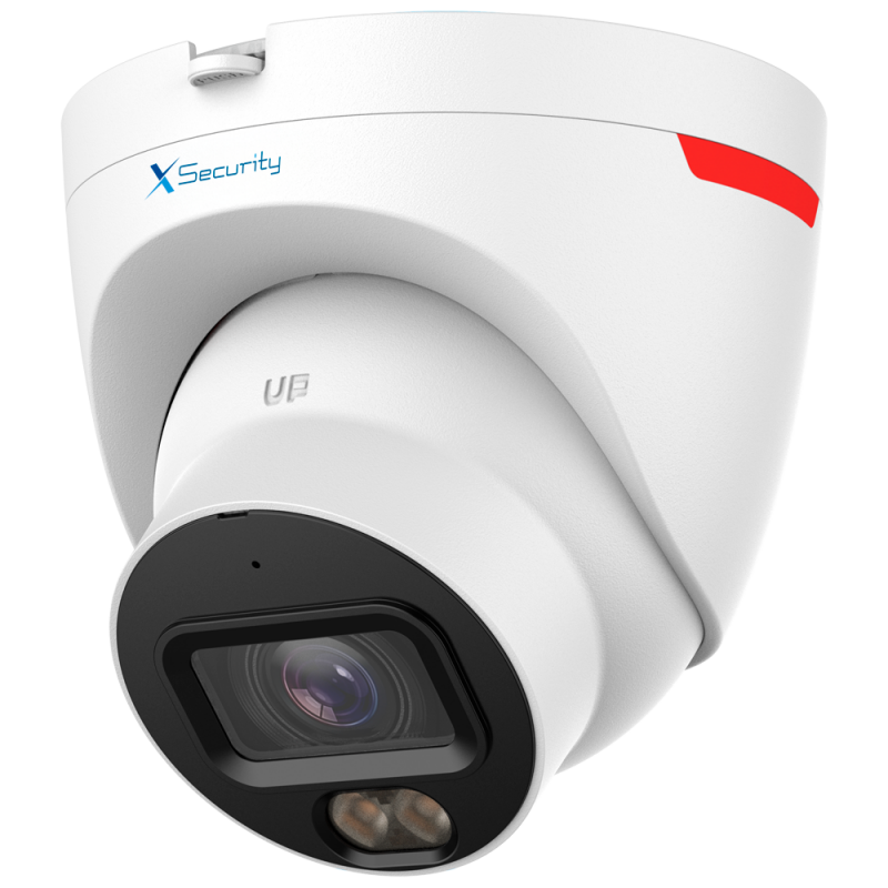 Cámara IP tipo turret X-Security Wizcolor de 8 megapíxeles con sensor 1/1,8" F1.0, resolución máxima de 3840 × 2160, equipada con lente fija de 2,8 mm, luz blanca con alcance de hasta 30 metros y tecnología WizSense para clasificación avanzada de personas y vehículos. Ofrece iluminación mínima de 0,0008 lux, grabación a color real las 24 horas incluso en baja iluminación, micrófono integrado y almacenamiento local en tarjeta MicroSD de hasta 256 GB. Compresión de vídeo en H.265, H.264, H.264H, H.264B y MJPEG, amplio rango dinámico WDR de 120 dB, protección impermeable IP67, compatible con ONVIF y PoE conforme a IEEE802.3af.