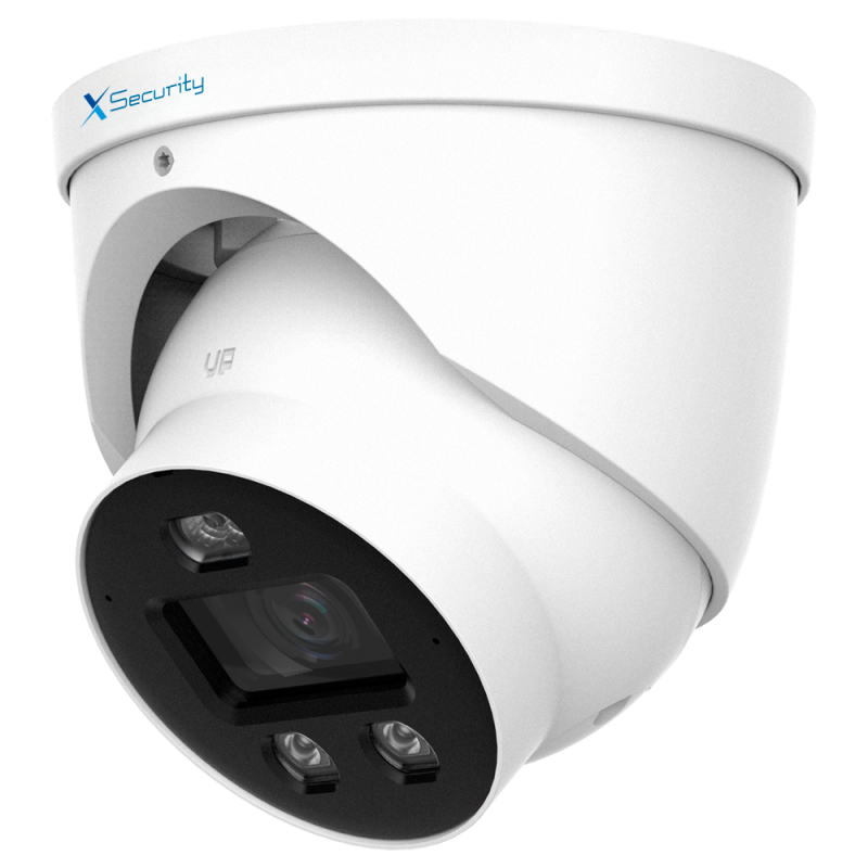 Cámara IP Turret X-Security WizColor, 4 megapíxel 2688x1520, sensor CMOS de 1/1.8 pulgadas, lente fija de 2.8 mm, iluminación IR y luz blanca con alcance de 30 metros. Imágenes nítidas durante el día y la noche, WDR de 120 dB, compresión de vídeo H.265 y H.264, micrófono integrado, almacenamiento en MicroSD de hasta 512 GB, clasificación avanzada de personas y vehículos con tecnología WizSense, funciones de detección inteligente y alarmas, impermeable con protección IP67 y carcasa metálica.