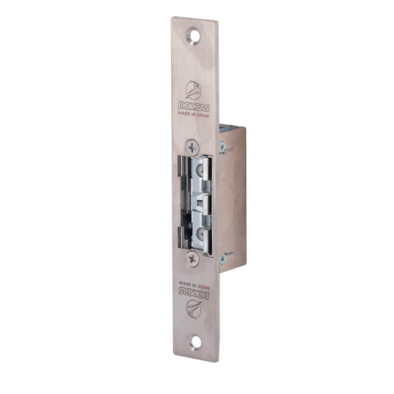 Abrepuertas eléctrico Dorcas para puerta sencilla, funcionamiento modo Fail Secure normalmente cerrado con memoria, pestillo radial regulable, fuerza de retención de 330 kg, admite alimentación de 10 a 24 V AC o DC, instalación sin corte en el frontal ni escotadura en la puerta, simétrico y reversible, fabricado en acero inoxidable, dimensiones compactas de 25,2 ancho por 160 alto por 28,5 fondo en milímetros, peso de 400 gramos, modelo encastrado EasyAccess, incluye material de instalación e instrucciones.