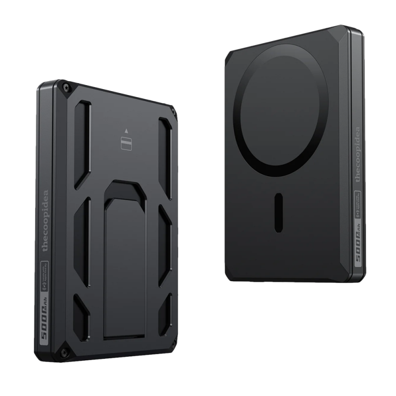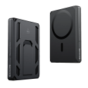 Power Bank con wallet magnético, capacidad de 5000mAh, compatible con protocolo MagSafe para carga segura y eficiente, integración certificada con FindMy, recarga mediante USB-C o inalámbrica, permite cargar dos dispositivos a la vez, soporte de metal plegable para mayor comodidad. Dispone de tecnología de aleación de zinc para bloqueo RFID, almacenamiento de hasta dos tarjetas bancarias, diseño compacto y ligero, color negro.
