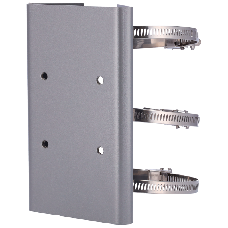 Soporte diseñado para mástiles y farolas, compatible con cámaras panorámicas y speed dome, indicado para instalaciones en exterior e interior, fabricado en acero inoxidable y acabado color gris. Adaptable a superficies cilíndricas, su diámetro útil es de 67 a 127 milímetros, incluye 3 bridas metálicas de alta resistencia.