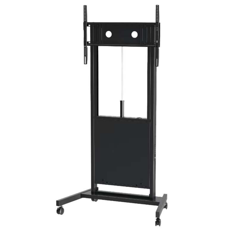 Soporte con ruedas motorizadas, diseñado para monitor de hasta 150 kg, VESA 800x600 mm y altura regulable eléctricamente. Proporciona una base estable mediante fijación a suelo y pared, adecuado para pantallas grandes en entornos que requieren máxima seguridad y estabilidad. Su mecanismo motorizado permite un ajuste de altura fácil a través de una botonera dedicada. Compatible con monitores VESA desde 800x600 mm, adaptable mediante brackets metálicos para ajustarse a diferentes distancias entre orificios. La estructura soporta hasta 150 kg, garantizando seguridad en el montaje y desplazamiento gracias a las ruedas con frenos. Incluye función bloqueo para niños mediante llave física, suministro eléctrico adaptable de AC de 100 a 240 V.