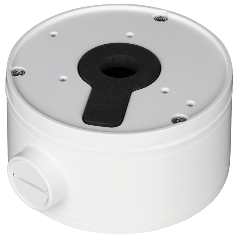Caja de conexiones diseñada para cámaras IPAi compatibles, fabricada en aleación de aluminio, dimensiones de 115,8 milímetros de diámetro por 60 milímetros de altura, peso de 630 gramos, se adapta para uso en interior y exterior, clasificación IP66, protección frente a polvo y agua, color blanco con referencia RAL9003, incluye pasador de cables.