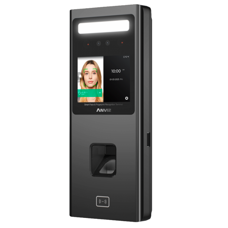 Terminal autónomo biométrico Anviz de control de acceso y presencia, con reconocimiento facial dual, lector de huella digital, tarjeta de proximidad EM y PIN numérico. Capacidad para 1.000 usuarios faciales, 3.000 huellas, 3.000 tarjetas o contraseñas y hasta 50.000 registros, pantalla táctil TFT de 2,8 pulgadas para administración local intuitiva, comunicación TCP/IP, WiFi, USB, RS485 y Wiegand, incluye controladora integrada con sensor de puerta, pulsador y relé, compatible con CrossChex Standard y CrossChex Cloud para gestión de usuarios, horarios y turnos en local o en la nube. Función timbre, 8 modos de control de presencia y gestión avanzada de turnos y horarios.