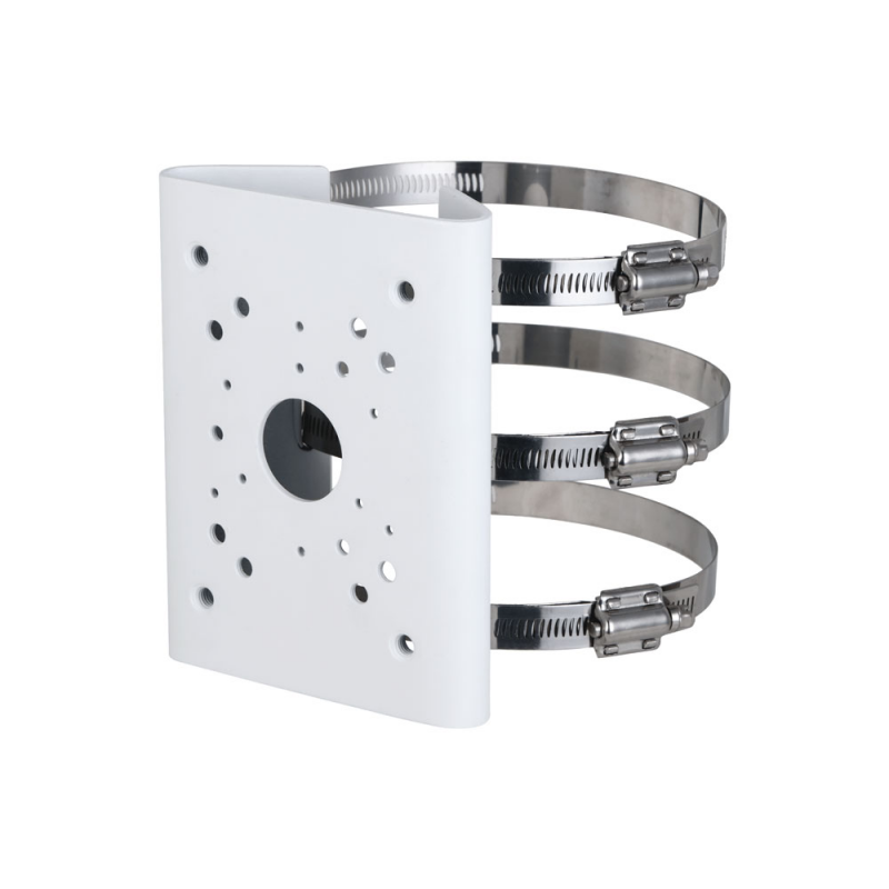 Soporte de montaje en poste para cámaras Dahua, fabricado en acero SECC y SUS304, capacidad de carga de hasta 15 kg, adecuado para instalación en postes de 80 a 150 milímetros de diámetro. El diseño incorpora abrazaderas metálicas reforzadas, proporciona un acabado en color blanco. Es compatible con cámaras Dahua y está pensado para aplicaciones en exteriores gracias a su alta resistencia ambiental.