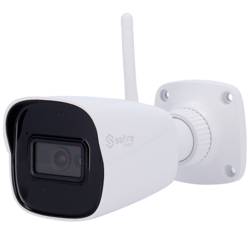 Cámara Bullet IP WiFi Safire Smart E1 con inteligencia artificial. Resolución de 5 megapíxel, CMOS progresivo de 1/2.7 pulgadas, lente fija de 2.8 mm, visión en 0 lux con IR, rango de alcance de luz blanca y LED infrarrojo de 30 metros. Clasificación de humano y vehículo mediante inteligencia artificial, audio IN, micrófono integrado, compatible con ONVIF y PoE, compresión H.265 y H.264, impermeabilidad IP67.
