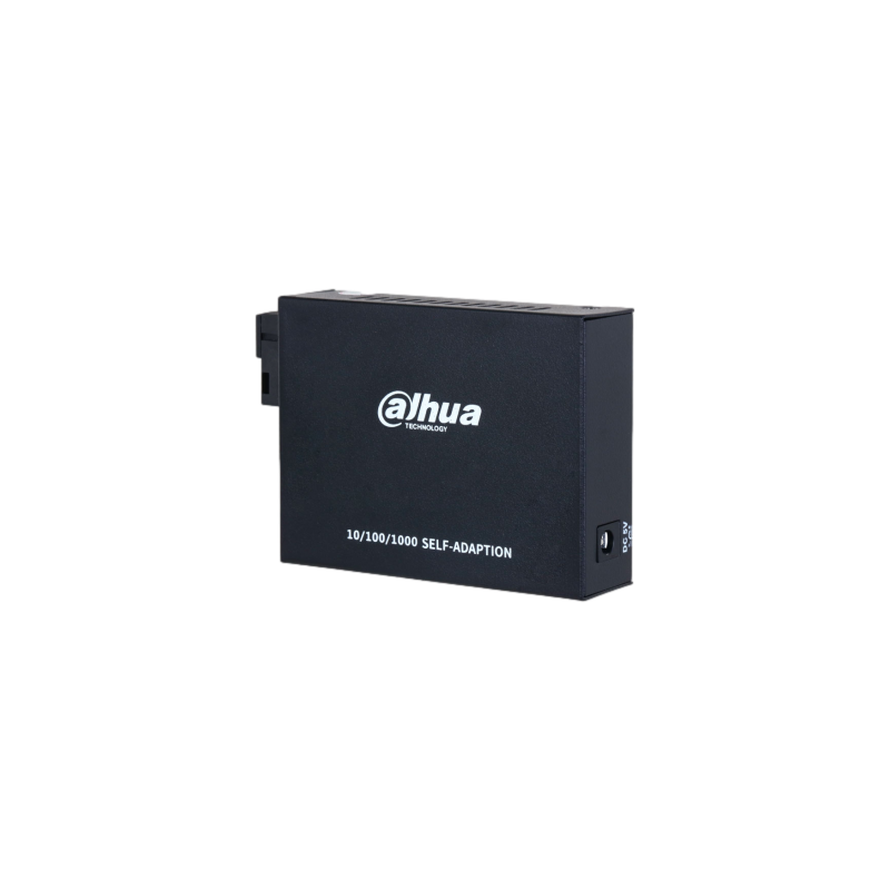 Transceptor óptico Ethernet Gigabit Dahua, equipado con 1 puerto RJ45 compatible con 10, 100 y 1000Base-T y 1 puerto óptico SC 1000Base-X. Admite fibra monomodo para transmisión hasta 20 kilómetros, longitud de onda de 1310 nm transmisión y 1550 nm recepción. Instalación sencilla tipo Plug and Play, protección integrada contra descargas eléctricas y funcionamiento continuo de 24 horas al día, 7 días a la semana. Alimentación de 5 a 12 VDC.