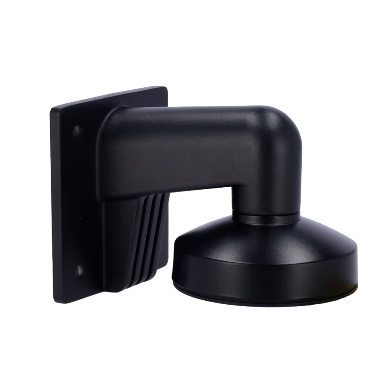 Soporte de pared para cámaras domo, apto para uso en exterior, fabricado en aleación de aluminio con tratamiento superficial de spray, compatible con dispositivos Hikvision, incluye pasador de cables, color negro.