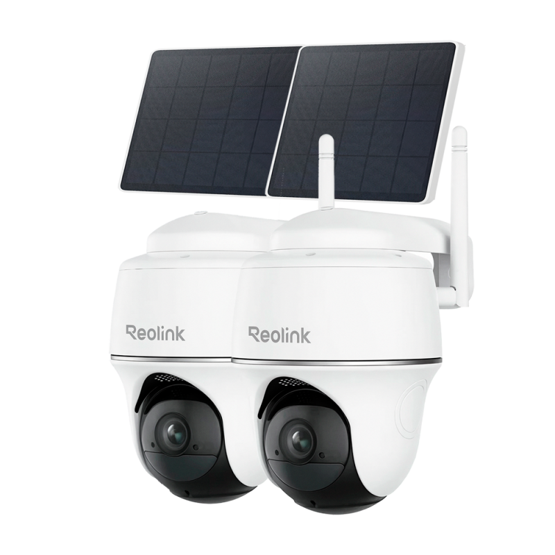 Kit de dos cámaras WiFi Reolink con batería recargable y panel solar de 3 W, resolución de 3 megapíxeles con sensor CMOS de 1/2,7 pulgadas, compresión detallada y visión nítida, detección avanzada por PIR para identificar personas y vehículos, comunicación bidireccional con micrófono y altavoz integrados, compatible con Alexa y Asistente de Google, almacenamiento mediante ranura MicroSD hasta 128 GB, apta para exteriores, resistente al agua con grado de protección IP65.