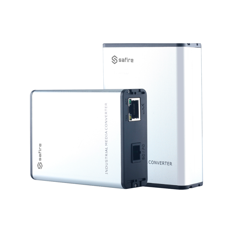 Kit industrial conversor de medios Safire. Incluye dos unidades, cada una con un puerto Ethernet RJ45 de 10 a 1000 Mbps y un conector SC monomodo simplex. Permite la conversión directa entre cableado de cobre y fibra óptica, asegurando conexiones fiables y estables en enlaces de hasta 3 kilómetros mediante fibra monomodo y auto-negociación de velocidad, con funcionamiento en full dúplex a 1 Gbps. Admite alimentación AC de 100 a 240 V o DC 5V 1A, cuenta con diseño compacto para fácil integración y rango de operación de −30 °C a 75 °C. Ideal para redes empresariales, CCTV, campus y telecomunicaciones, con certificación CE, FCC y RoHS.
