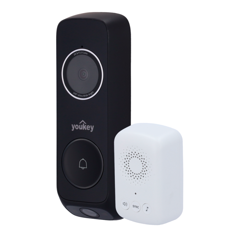 Videotimbre inteligente Youkey con doble lente, tecnología Wi-Fi 6 y detección avanzada de humanos y paquetes. Cámara superior de 3 megapíxeles, visión gran angular de 160 grados, cámara inferior de 2 megapíxeles, campo visual de 101 grados, y sensor PIR real. Ofrece iluminación infrarroja de 5 metros y luz blanca de 2 metros. Conexión Wi-Fi de doble banda, resistencia al agua IP65, y alimentación AC de 16 a 24 V. Incluye timbre interior inalámbrico y grabación en memoria interna y nube.