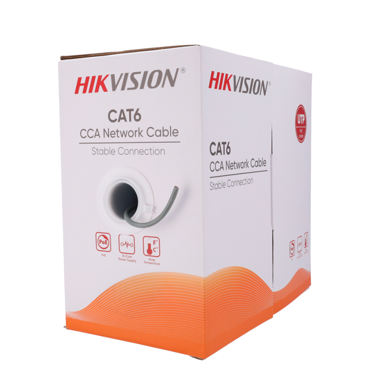 Cable UTP Hikvision categoría 6, conductor CCA, diámetro de 0,56 mm, certificado Eca UL CM, suministrado en caja de cartón de 305 metros, cubierta de PVC en color gris, diseñado para instalaciones de interior, cumple con los requisitos de seguridad contra incendios y rendimiento eléctrico para cableado estructurado de redes.