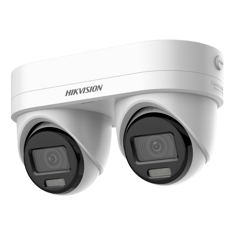 Cámara Turret IP de la gama PRO de Hikvision, resolución de 4 megapíxeles, doble canal, ofrece imágenes de alta definición de 2688x1520, lente de 2.8 o 4 mm en una sola cámara, iluminación infrarroja inteligente hasta 30 metros, detección de movimiento avanzada y tecnología AcuSense 3.0 para reducción de falsas alarmas en cruce de línea, intrusión en área, región de entrada y salida, incorpora luz roja y azul disuasoria y luz blanca, incluye micrófono y altavoz integrados, alimentación PoE+, protección impermeable IP67 y anticorrosiva NEMA 4X.