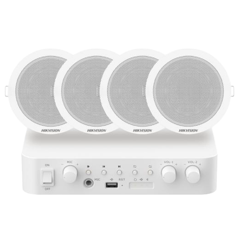 Kit de audio compuesto por un amplificador de 60 W y cuatro altavoces de techo de 6 W, diseñado para una distribución uniforme del sonido en oficinas, tiendas, hogares o locales comerciales. Su instalación sencilla y discreta permite integrarlo fácilmente en techos, conservando una apariencia limpia y una experiencia de audio clara y equilibrada en cualquier ambiente.