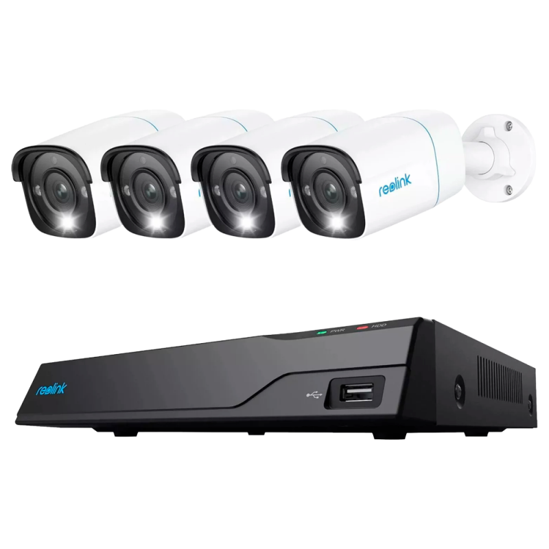Kit de videovigilancia Reolink con NVR PoE de 8 canales y 4 cámaras PoE de 8 megapíxeles, incluye disco duro de 2TB, tecnología de detección avanzada para personas, mascotas y vehículos, funciones de audio bidireccional, opción de almacenamiento en la nube bajo suscripción, configuración simple y compatibilidad con cámaras Reolink PoE y cámaras wifi cableadas, cámaras aptas para uso exterior, cuerpo en color blanco.