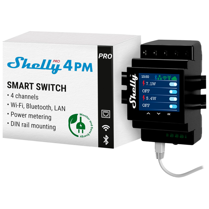 Shelly Pro 4PM, interruptor inteligente para carril DIN, permite la gestión de hasta 4 canales independientes con un máximo de 16A por canal y 40A en total, incluye medidor de potencia, pantalla a color de 1,8 pulgadas, teclas de navegación y comunicación por WiFi, Bluetooth y LAN, compatible con Alexa y Google Home, soporta de 110 a 240 V, funciona sin necesidad de hub y permite control remoto de electrodomésticos.