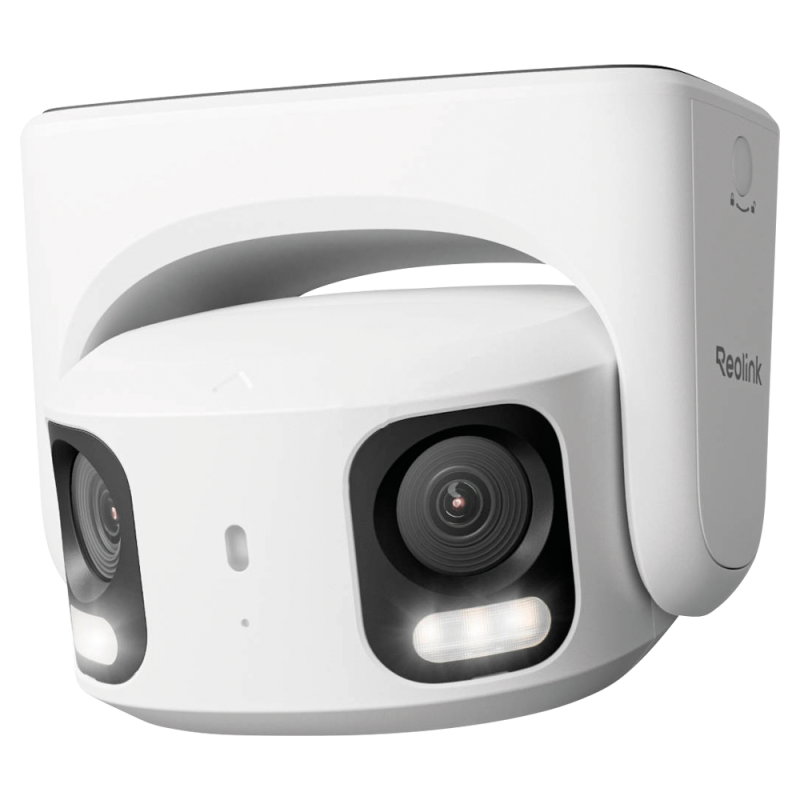 Cámara IP Reolink doble lente, resolución 8 megapíxeles de 5120x1552 a 30 FPS en 4K Ultra HD, tecnología PoE, visión nocturna a color mediante focos LED, alcance infrarrojo de 30 metros, detección inteligente de persona, vehículo y mascota mediante inteligencia artificial, zoom óptico 5X, audio bidireccional con micrófono y altavoz integrados, ranura MicroSD de hasta 512 GB, adecuada para instalación en exteriores, integra comunicación PoE, compatible con Asistente de Google, opción de servicio en la nube mediante suscripción.