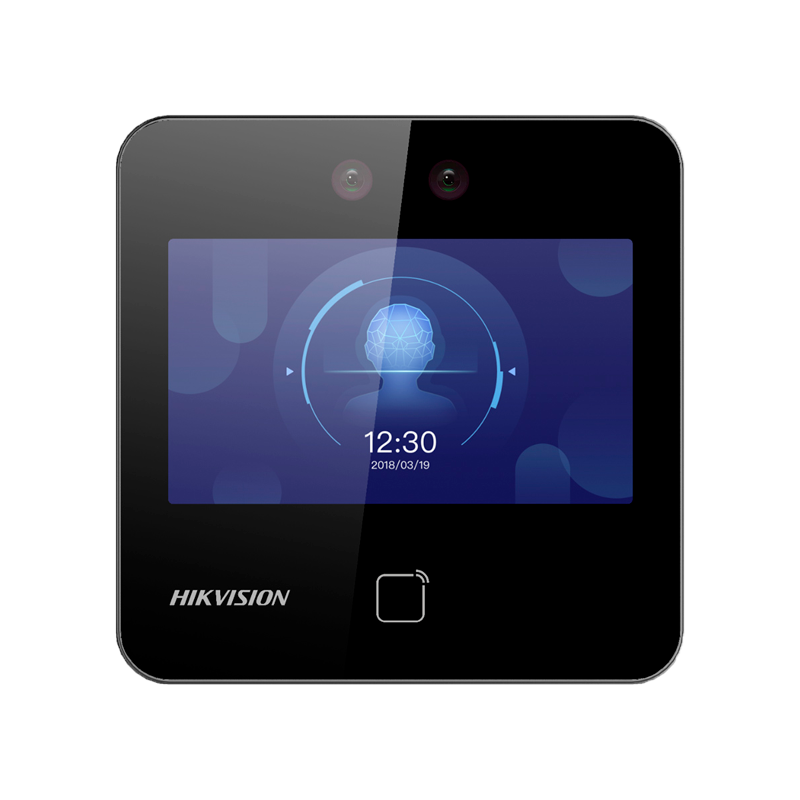 Control de acceso y presencia. Reconocimiento facial, tarjeta EM y PIN, 1.500 usuarios, 150.000 registros, TCP/IP, USB, RS485 y Wiegand. Controladora integrada con sensor, pulsador y relé. Compatible con iVMS-4200 y Hik-Connect