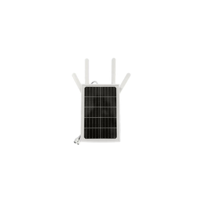 SolarRouter4G. Router industrial 3G/4G para exterior con panel solar de 15 W y batería integrada (8 x 18650 de 2600 mAh). Soporta Nano SIM, WiFi 2.4 GHz 802.11b/g/n (hasta 8 dispositivos), 1 puerto LAN y cobertura en campo abierto de 20–60 m. Pensado para instalaciones sin red eléctrica y despliegues remotos, soporta 4–6 cámaras. Carga aprox. 24 h y autonomía de hasta 100 h de autonomía sin sol. Bandas LTE B1/B3/B5/B7/B8/B20 (configurable por región) y WCDMA B1/B8.