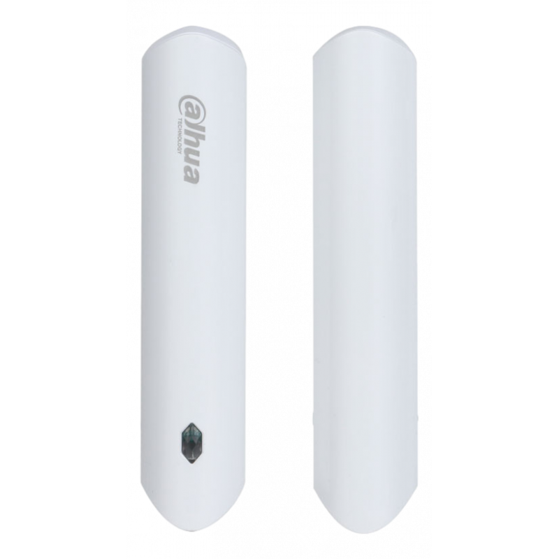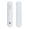 Contacto magnético vía radio Dahua con sensor de choque e inclinación, compuesto por un sensor y un imán, activa una alarma cuando se abre una puerta armada, muestra el estado de puertas y ventanas en la App DMSS en tiempo real, notificaciones de eventos de alarma, incorpora medición de temperatura, detección de intensidad de señal vía radio, alarma de batería baja.