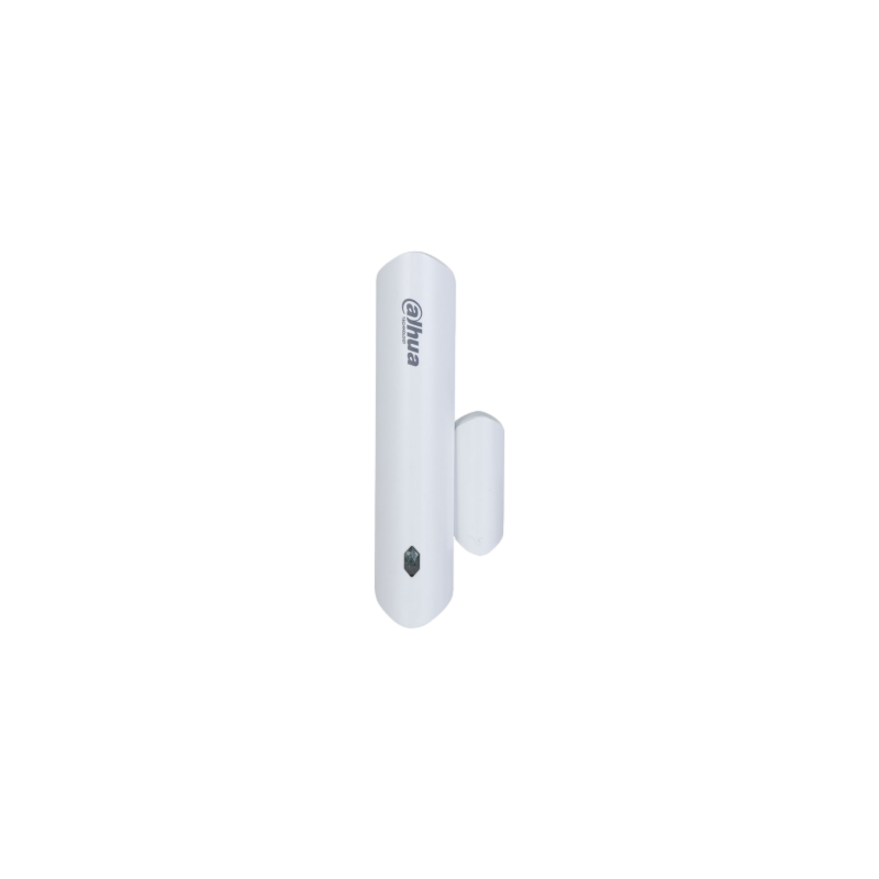 Contacto magnético vía radio Dahua para puertas y ventanas, utiliza comunicación RF 868 MHz con salto de frecuencia y canal bidireccional, integra cifrado AES128 y permite un alcance de hasta 1200 metros en espacio abierto, dispone de entrada externa de 1 canal por contacto seco, función antisabotaje, aviso de batería baja y monitorización de temperatura, se alimenta por pila CR123A.