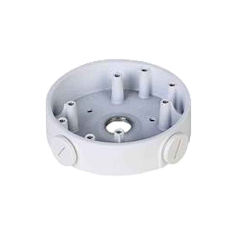 Caja de conexiones Dahua, diseño compacto para instalación mural de cámaras, organiza el cableado con salidas en la parte inferior y lateral, capacidad de carga de hasta 1 kg, fabricada en aleación de aluminio, protección anticorrosión básica.