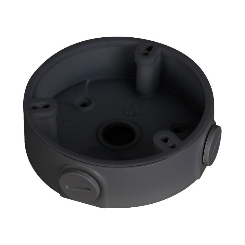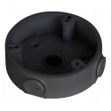 Caja de conexiones Dahua, diseño compacto y elegante, salidas de cable inferior y lateral, adecuada para montaje mural de cámaras Dahua, soporta hasta 1 kg, fabricada en aleación de aluminio en color negro, nivel anticorrosión básico.