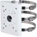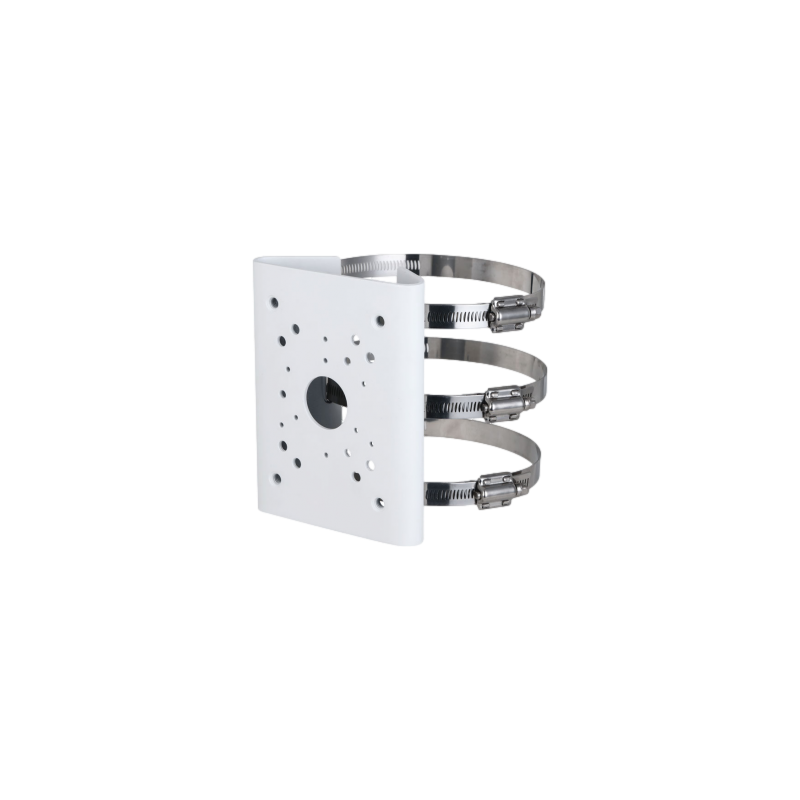 Soporte de montaje en poste para cámaras Dahua, fabricado en acero SECC y SUS304, capacidad de carga de hasta 15 kg, adecuado para instalación en postes de 80 a 150 milímetros de diámetro. El diseño incorpora abrazaderas metálicas reforzadas, proporciona un acabado en color blanco. Es compatible con cámaras Dahua y está pensado para aplicaciones en exteriores gracias a su alta resistencia ambiental.