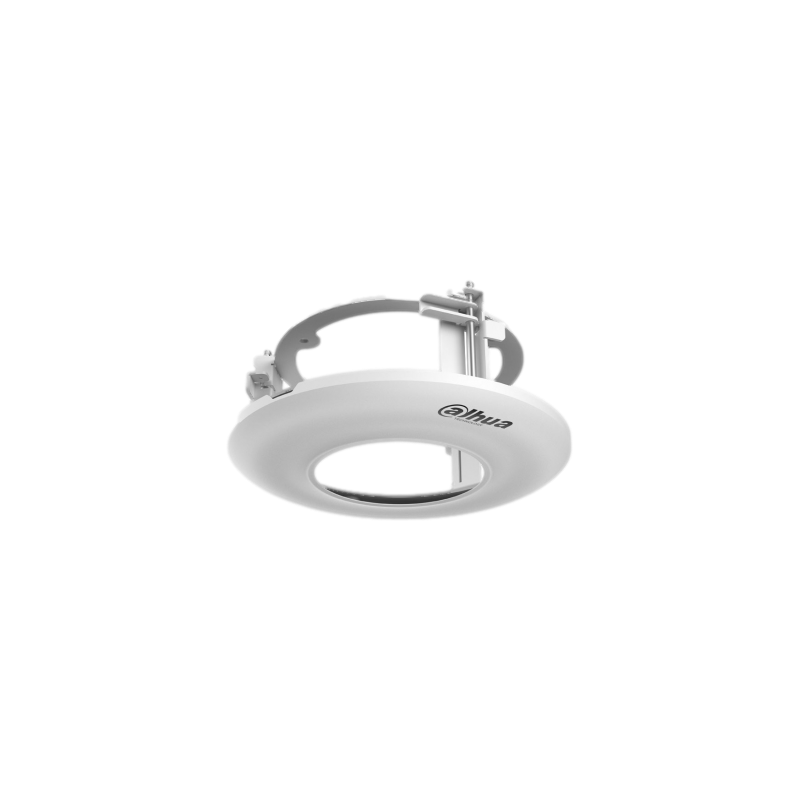 Soporte de empotrar en techo para domos Dahua, fabricado en SPCC y PC, diseñado para instalación sobre superficie superior y con capacidad de carga máxima de 1 kg, acabado en color blanco, permite una fijación estable de la cámara sin obstaculizar el campo de visión, apto para temperaturas de funcionamiento de -40 °C a +60 °C, facilita el montaje, desmontaje y mantenimiento del sistema de videovigilancia en espacios interiores o exteriores.
