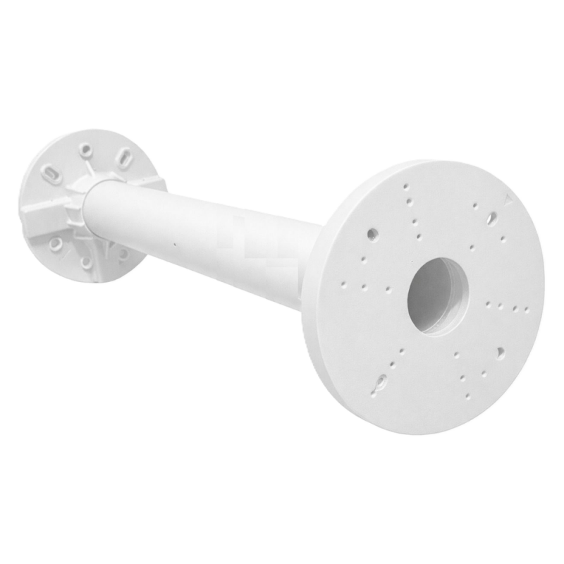 Soporte de techo para cámaras domo, permite instalación en interiores y exteriores, fabricado en plástico resistente en color blanco, altura de 50 centímetros y base circular de 12.1 centímetros de diámetro. Diseñado para garantizar un montaje seguro y estable en diferentes entornos, ligero y adecuado para diversas aplicaciones de videovigilancia.